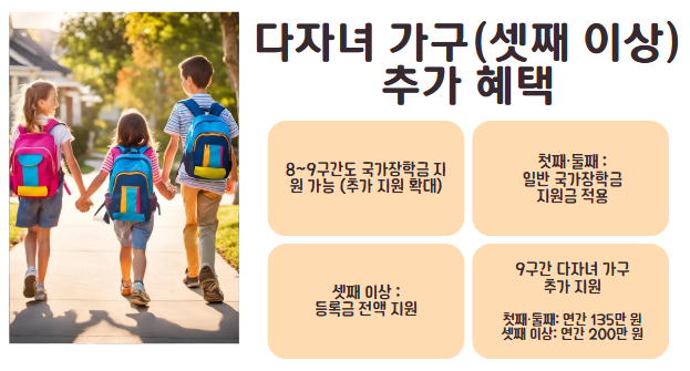다자녀 가구(셋째 이상) 학생은 별도의 추가 지원도 받을 수 있습니다.