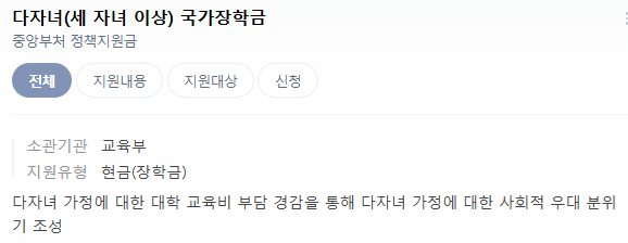 - 셋째 이상: 등록금 전액 지원