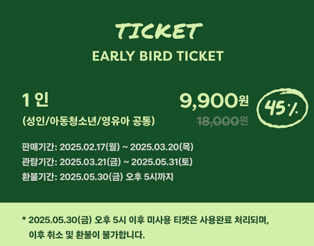 - 입장료: 18,000원 (얼리버드 할인 적용 시 9,900원)